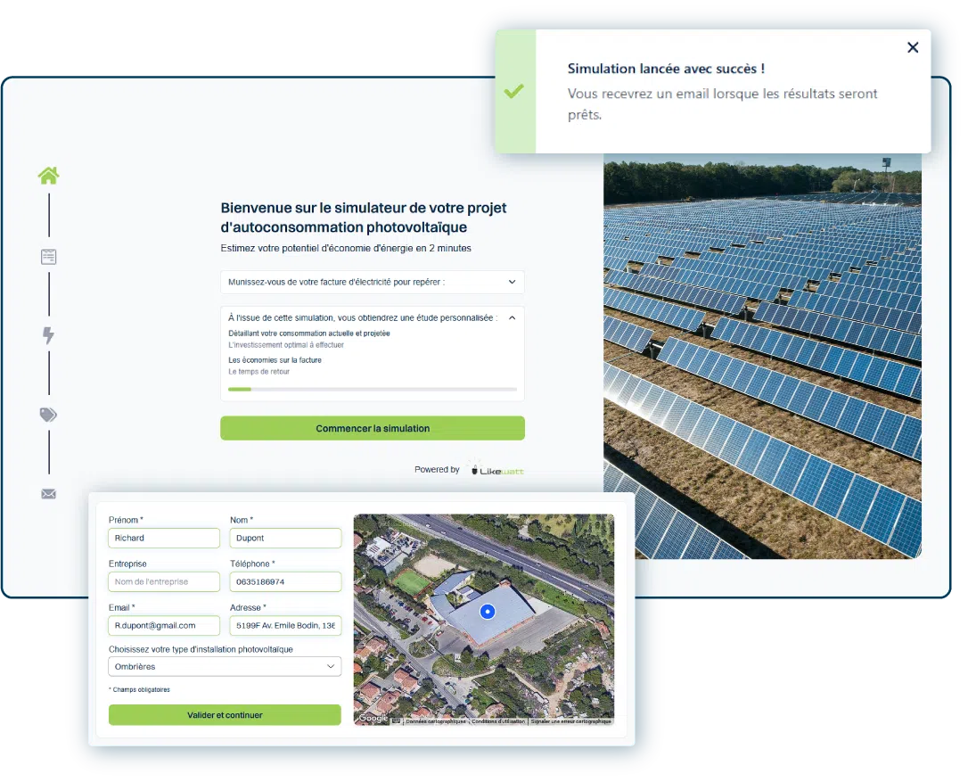 Le prospect simule son projet d’autoconsommation, comprend son potentiel… et vous recevez un projet photovoltaïque déjà qualifié.